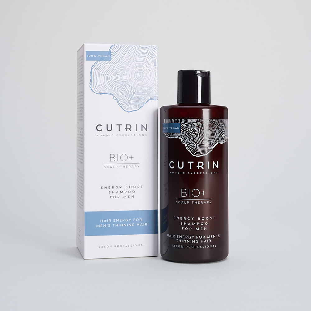 CUTRIN BIO+ puhdistava ja vahvistava shampoo. Ennenaikaisesta hiustenlähdöstä kärsiville miehille. Virkistää ja antaa lisää tuuheutta. CUTRIN Recharge Energy -teknologia yhdistää luonnollisen pohjoismaisen männynkaarnauutteen voimakkaat antioksidantit sekä hiusten vahvuutta tukevat Procapil™ ja Redensyl™ aktiiviaineet.